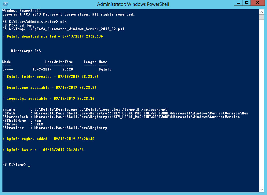 I hope this PowerShell script comes in handy for you whenever you want to use BgInfo on a Windows 2012 R2 server or when you create a Windows 2012 R2 VM template.