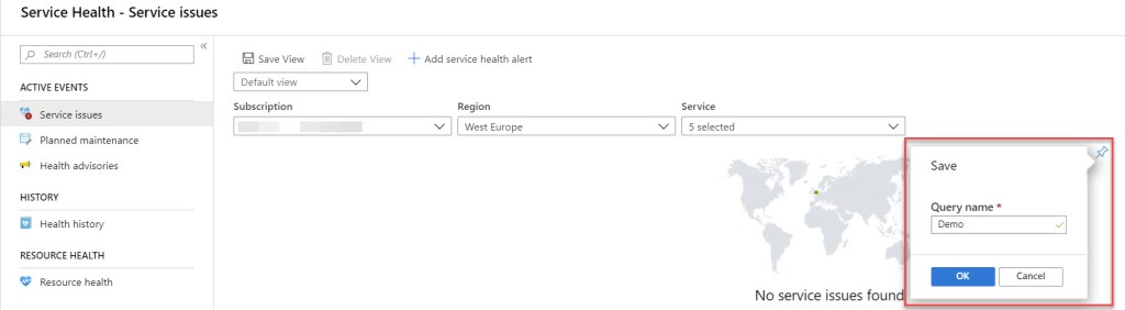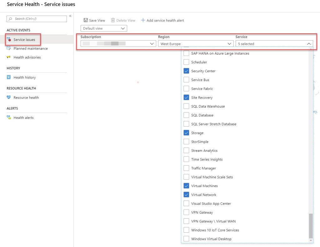 To personalize the world map, select all Azure Subscription(s), Region(s) and Service(s) you want to be informed about on the Service issues event page.
