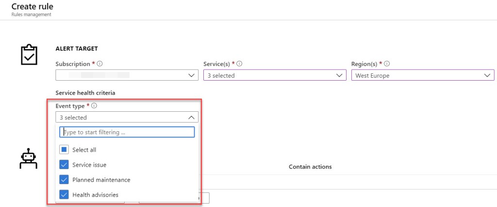 Under Event type, choose the event types you want to be alerted for (you can select all or just one or two). The event types you can choose about are: Service issue, Planned maintenance and Health advisories.