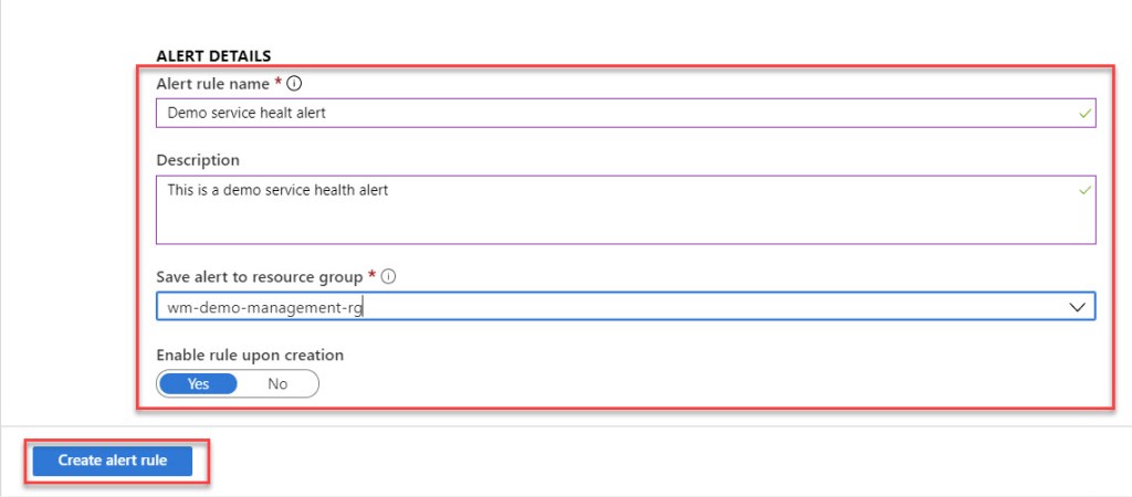 The specify an Alert rule name and Description. Then select the Resource group where you want the alert to be saved and finally click on Create alert rule to create it.