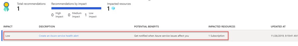 If you did not setup any service health alert you will also be advised to set one up trough the new Operational excellence category in Azure Advisor.