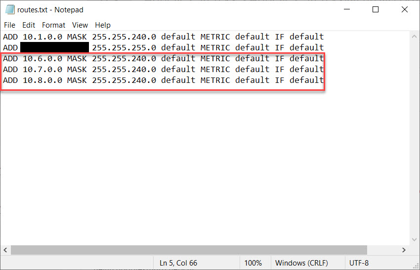 In the opened routes.txt file, add the static route(s) for the newly added VNet(s).