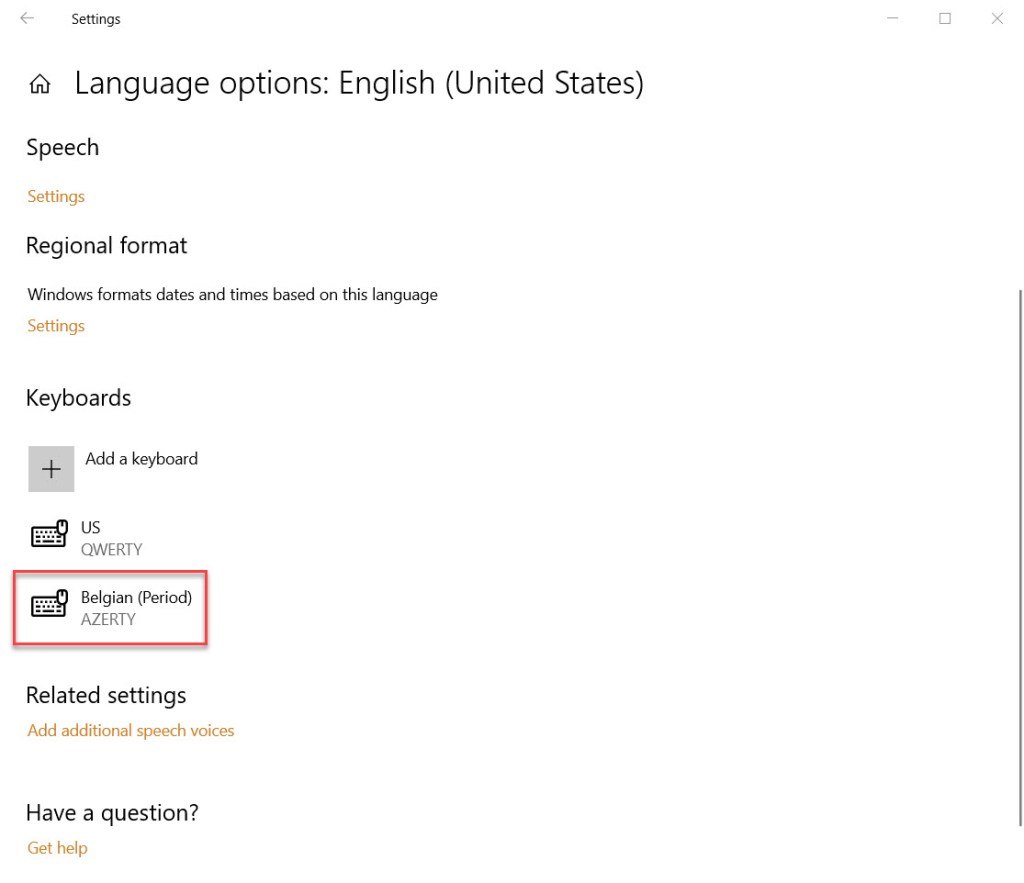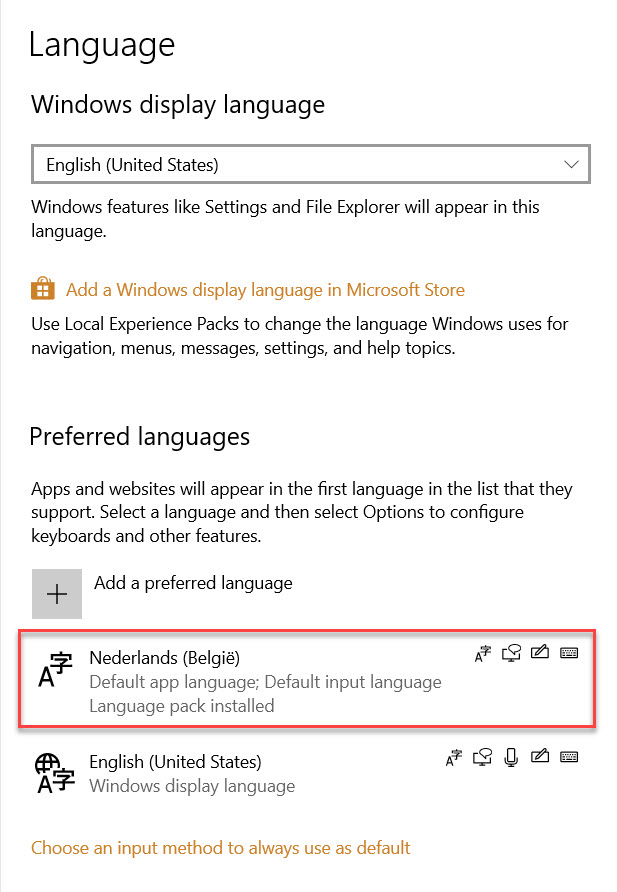 I am a Belgian and my mother tongue is Dutch, but as an ITPro, I like to have my Windows 10 display language, Microsoft Store and Windows Apps language set to English (United States) with Belgian period (Azerty) as my preferred keyboard setting.