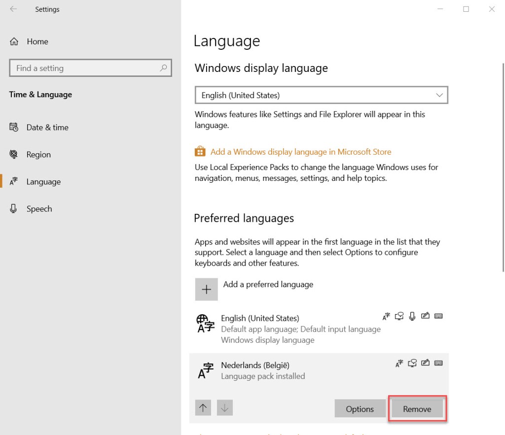 Select Language, and at the Preferred languages section, you can set Nederlands (België) as the second language or choose to Remove it completely (like I always do).