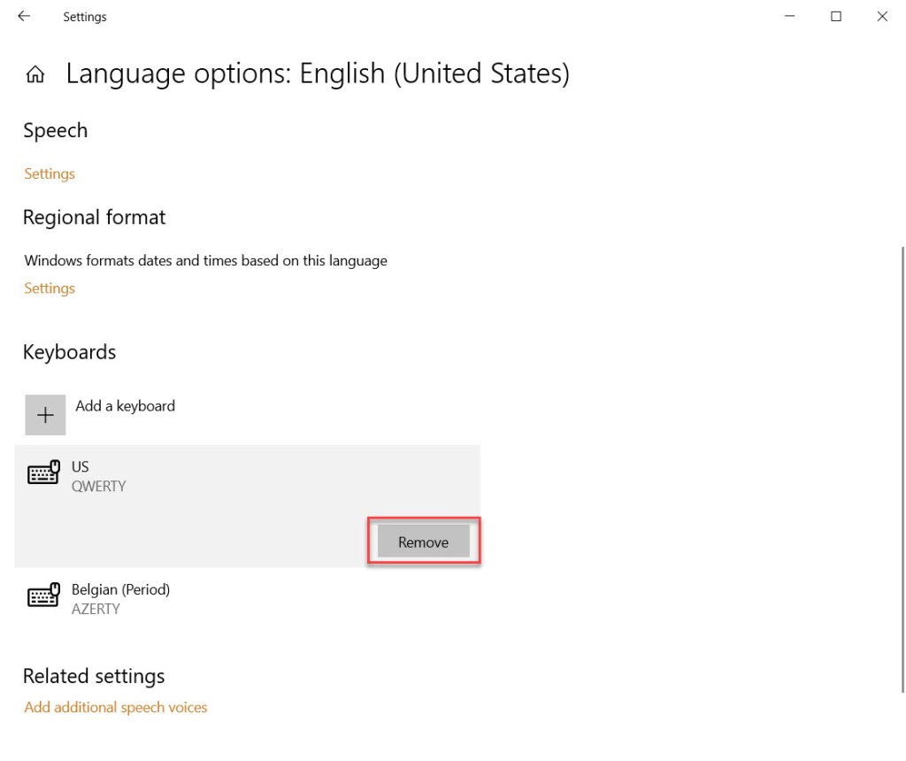 When the new keyboard is added you can remove the US (QWERTY) keyboard. To do so, select the US QWERTY keyboard and click Remove.