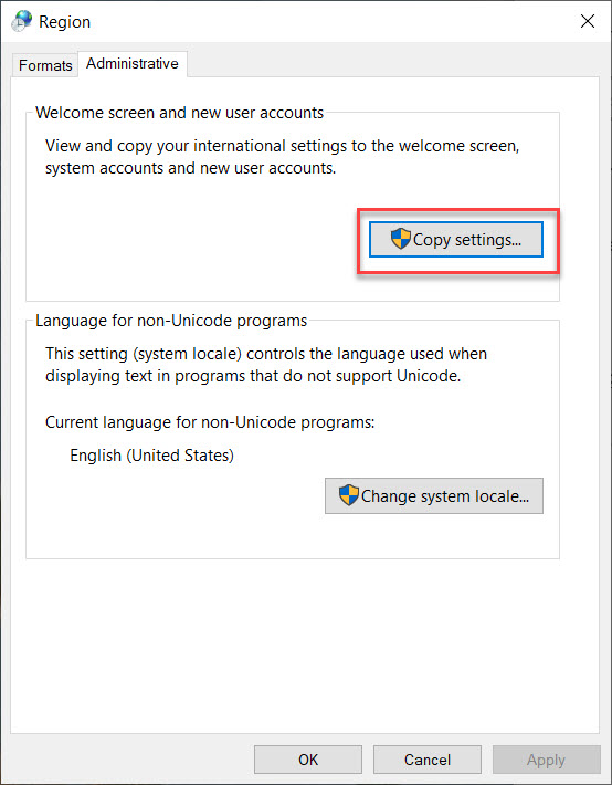 In the Region dialog window, select the Administrative tab and click on Copy settings…