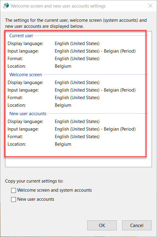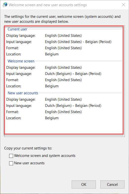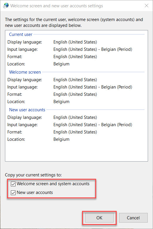 Tick the checkbox for Welcome screen and system accounts and for Newuser accounts to copy the Current user settings. Click OK to close.
