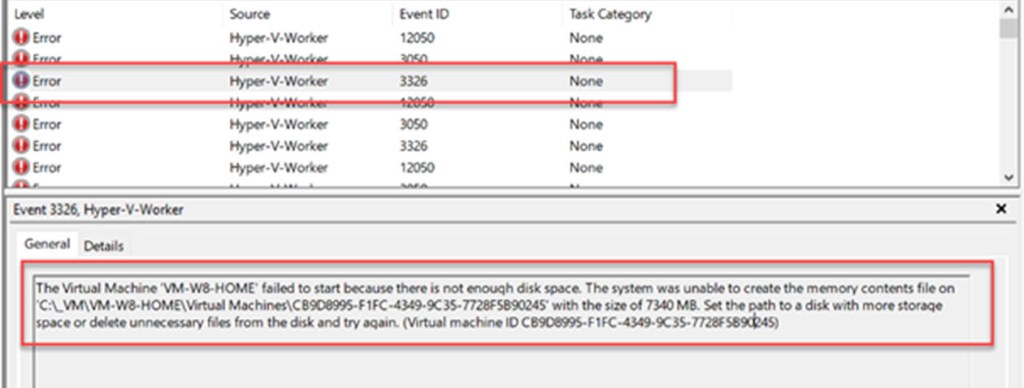 The Virtual Machine ‘VM-W8-HOME’ failed to start because there is not enough disk space. The system was unable to create the memory contents file on ‘C:\_VM\VM-W8-HOME\Virtual Machines\CB9D8995-F1FC-4349-9C35-7728F5B90245’ with the size of 7340 MB. Set the path to a disk with more storage space or delete unnecessary files from the disk and try again. (Virtual machine ID CB9D8995-F1FC-4349-9C35-7728F5B90245)