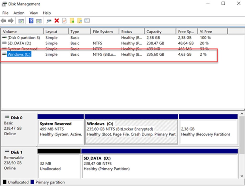 The error indicates that not enough free space is available on the host which causes problems to start the VM. The View in Disk Management (tap the Windows key + R to open Run, type diskmgmt.msc in the empty box and tap OK) indeed shows that the C: drive only has 2 % free, which is not sufficient to start the VM.