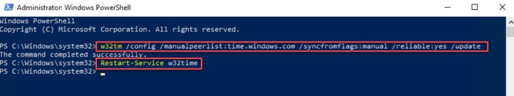 w32tm /config /manualpeerlist:time.windows.com /syncfromflags:manual /reliable:yes /update