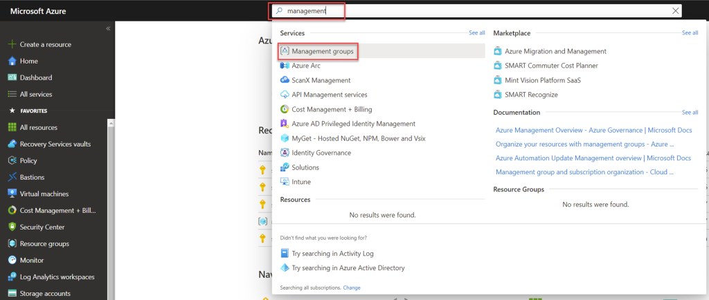 But these days there is also another and even faster way. Type in management into the global search bar and select Management groups.