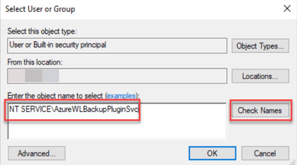 Because the NT SERVICE\AzureWLBackupPluginSvc account is already created during the VM registration and the SQL discovery phase, you can enter the account name under the Enter the object name to select. Click Check Names to resolve the name and select OK.