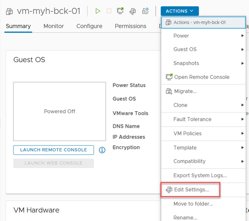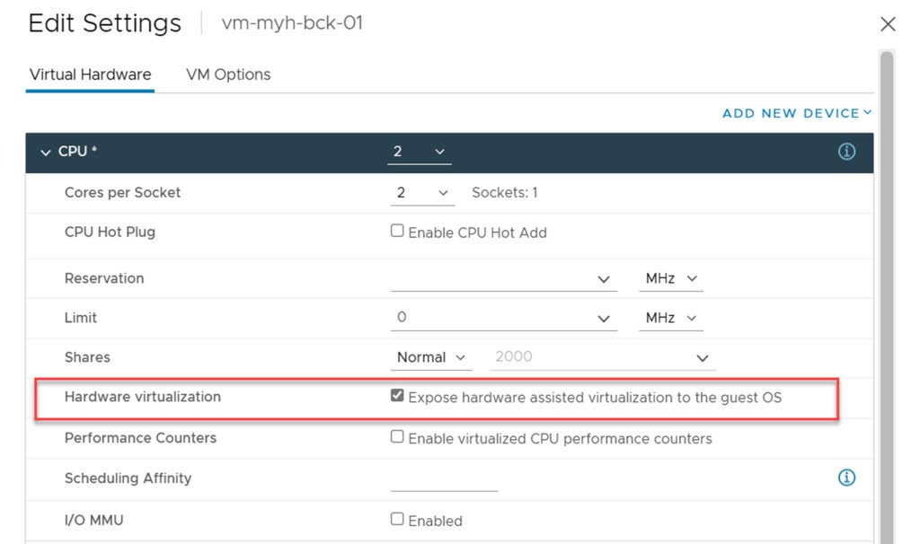 First of all, shut down the VM (in my case I used the vCenter Server) and open the Virtual Machine Settings. Then go the Virtual Hardware tab and expand the CPU options.