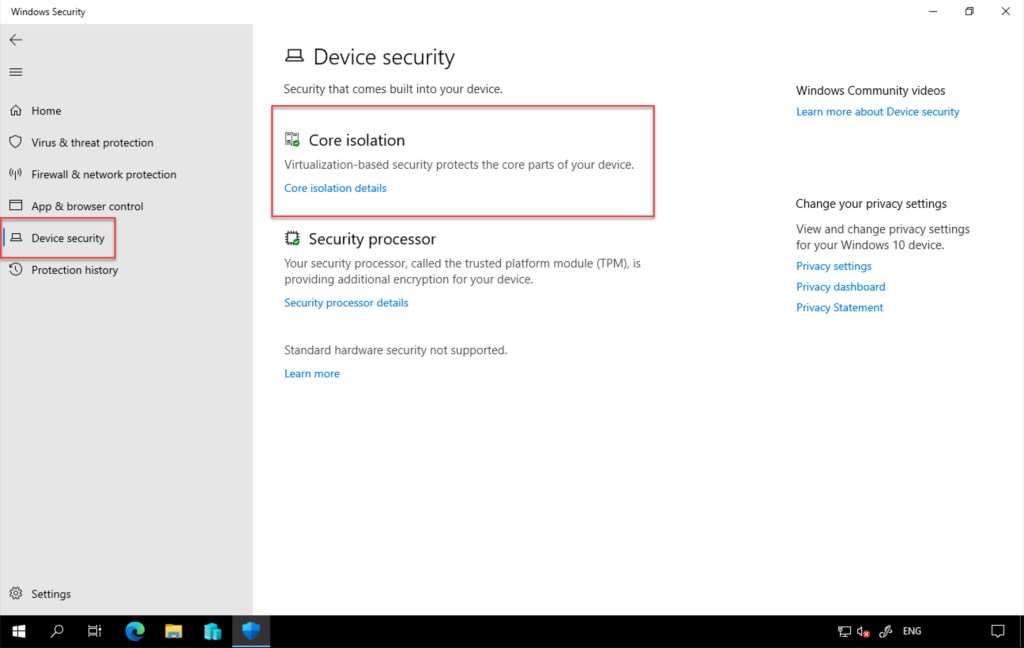 On the Windows Security window, select Device security and click on Core isolation details.