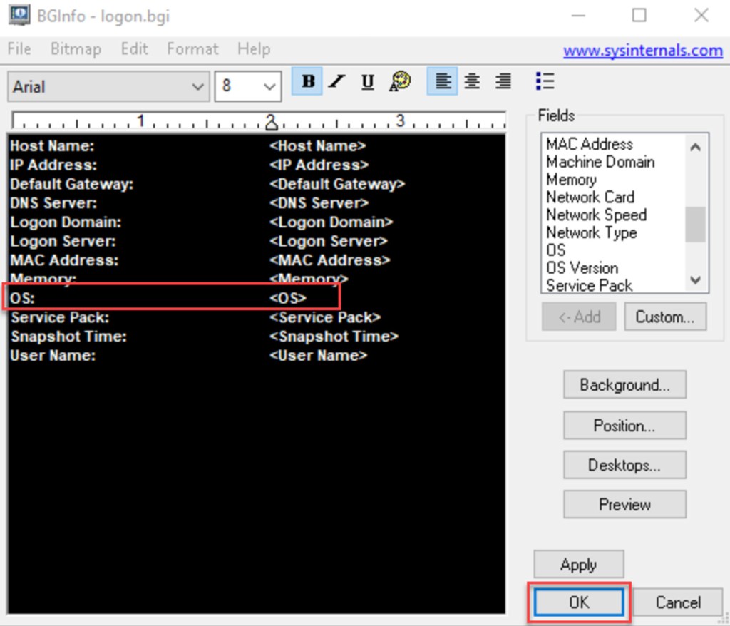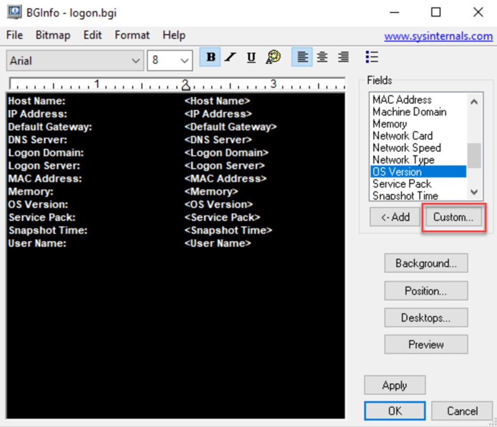 Now you can find the customized field (in my case OS) under the Fields list on the BGInfo main window, from where you can <-Add it to your customized file.