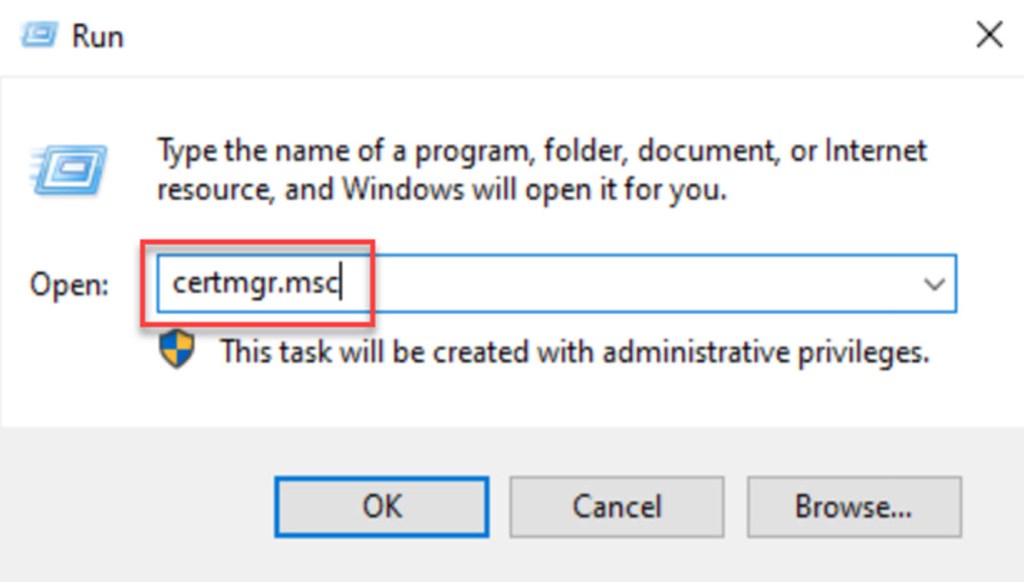 Both certificates are also stored in the Current User’s Personal Certificate Store (on the server or client pc where you ran the PowerShell script). You can check this by opening Run (Windows key + R) and typing in certmgr.msc followed by pressing Enter.