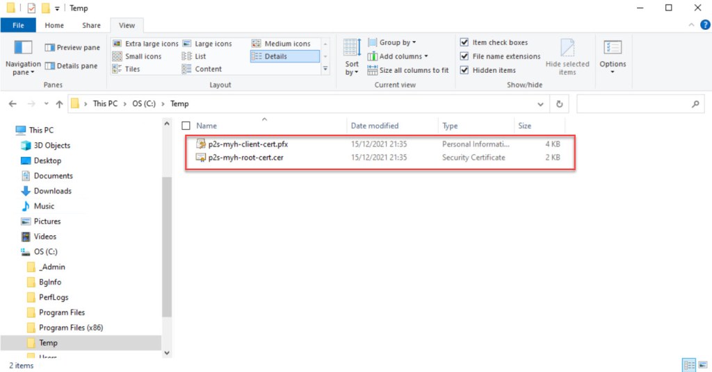 Then both certificates are exported to the C:\Temp folder, which is created if it not already exisits.