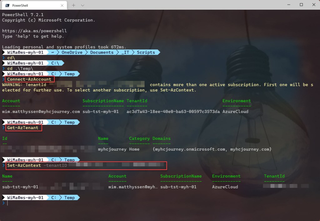 If you are not running the script from Cloud Shell, don’t forget to sign in with the Connect-AzAccount cmdlet to connect your Azure account. And if you have multiple tenants, select the proper tenant with the Set-AzContext -tenantID “xxxxxxxx-xxxx-xxxx-xxxxxxxxxxxx” cmdlet before running the script. You can list all tenants for the current user with the Get-AzTenant cmdlet.