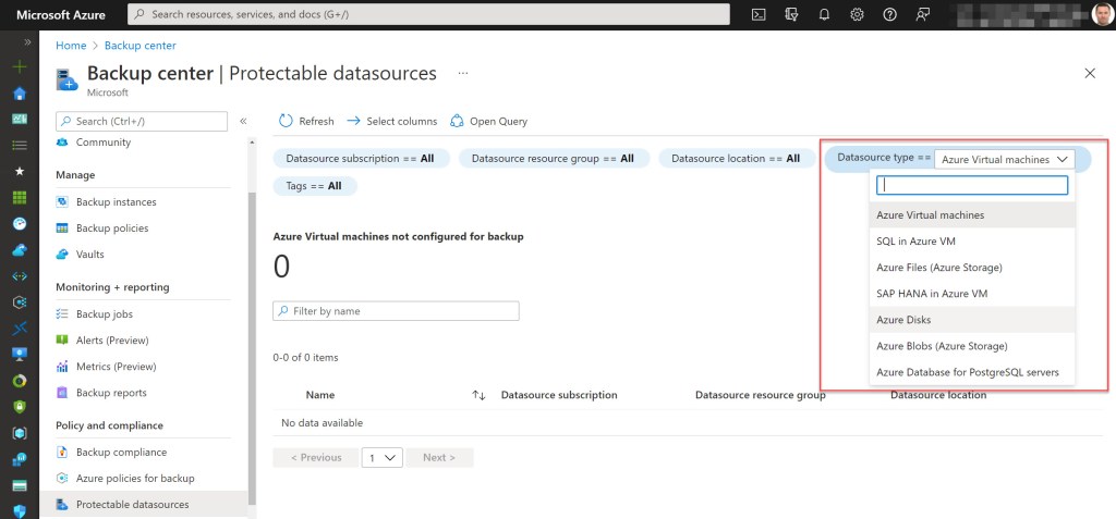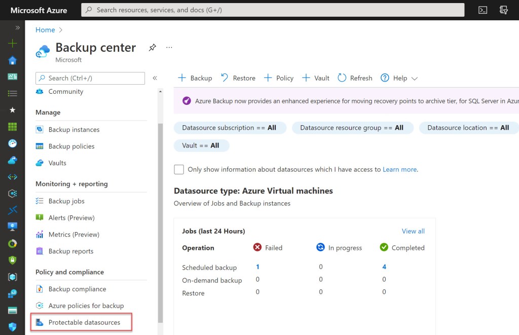 In the Backup center screen (blade), select the Protectable Datasources menu item under Policy and compliance.