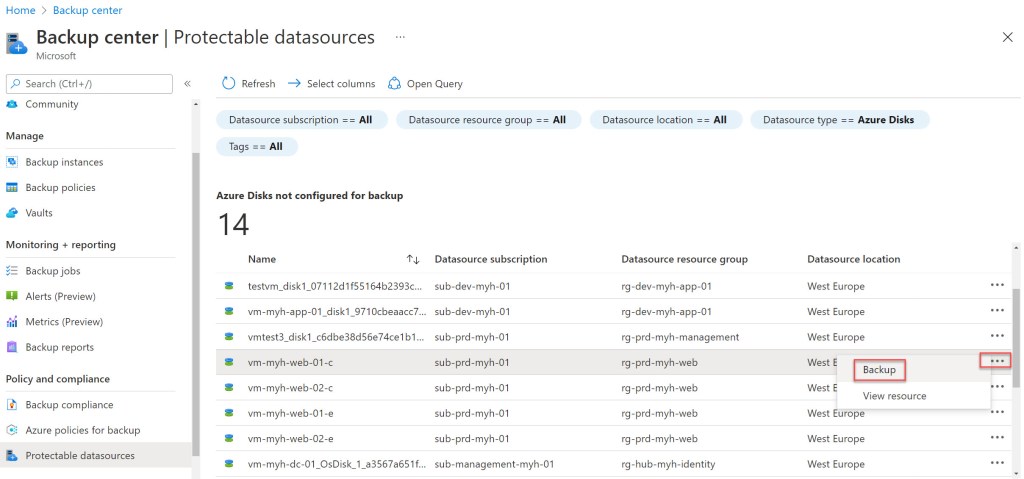 If you then identified a datasource that needs to be backed up, you can simply right-click on the three ellipsis on the right hand side of the screen (…) and select Backup to configure backup for the resource.