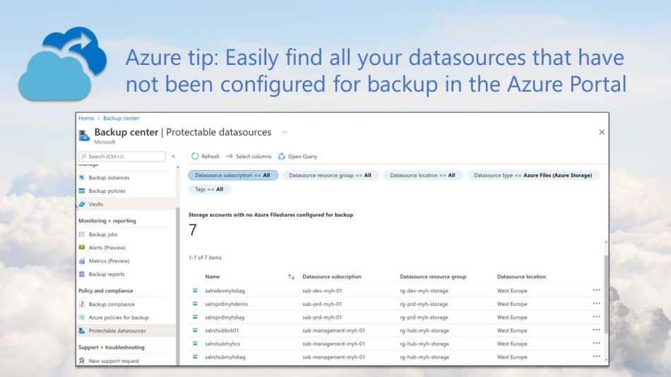 But even then, from time to time it is advised or even necessary to check if all required resources (datasources) are backed up or to identify the ones that are currently not protected. Luckily there is an easy and quick way to find this out trough the Azure Portal with the use of Azure Backup Center, which I will show you in this blog post.