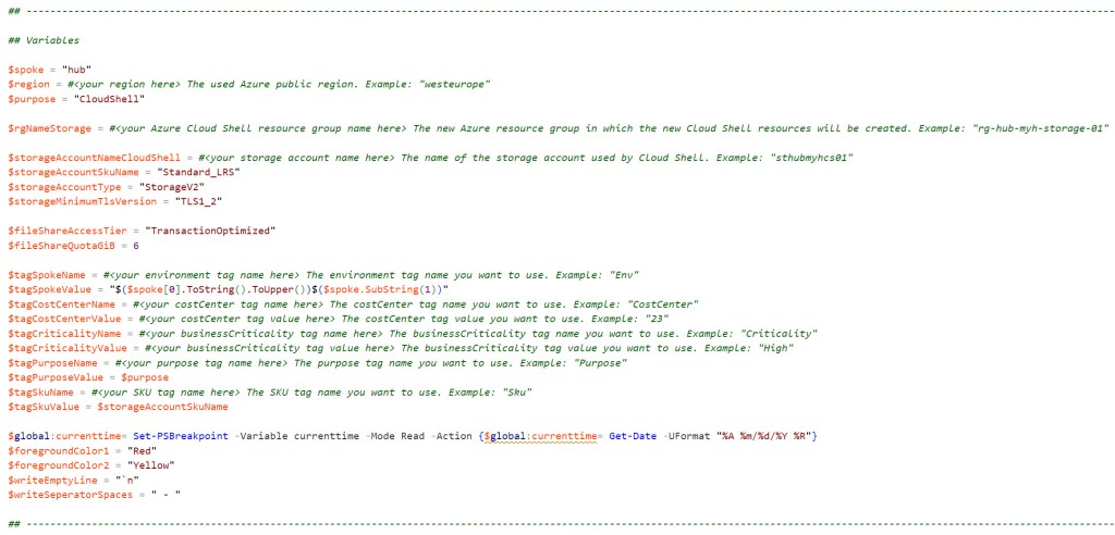 To use the script copy and save it as Setup-Azure-Cloud-Shell.ps1 or download it from GitHub. Then before using the script, adjust all variables to your use (you can find an adjusted example in a screenshot below) and then run the customized script with Administrator privileges from Windows Terminal, Visual Studio Code, or Windows PowerShell.