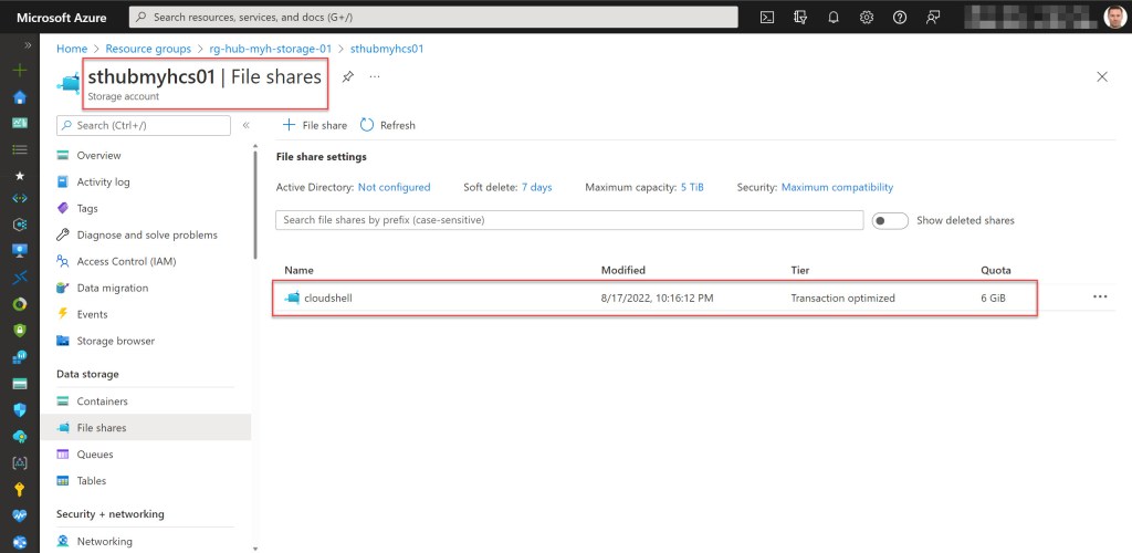 - Create an Azure file share for Cloud Shell with a size of 6 GiB if it not already exists. Also apply the necessary meta data to this file share.
