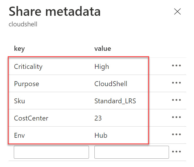 Update-AzRmStorageShare -ResourceGroupName $rgNameStorage -StorageAccountName $storageAccountNameCloudShell -Name $fileShareName -Metadata $tags | Out-Null