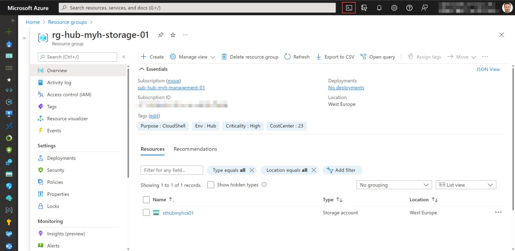 - Create a resource group for the Cloud Shell resources if it not already exists. Also apply the necessary tags to this resource group.