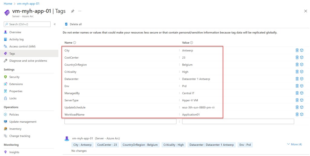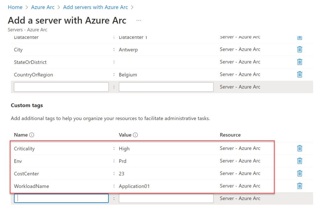 To help you on your way and to give you an some more practical examples, you can find a list of minimum suggested tags, I mostly use in combination with Azure Arc-enabled servers: