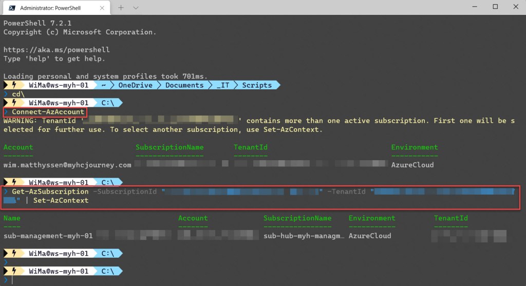 Open Windows Terminal (with Administrator privileges) and sign in with the Connect-AzAccount cmdlet to connect your Azure account. Then select the proper tenant with the Set-AzContext -tenantID “xxxxxxxx-xxxx-xxxx-xxxxxxxxxxxx” cmdlet, if you have multiple tenants. You can list all tenants for the current user with the Get-AzTenant cmdlet.
