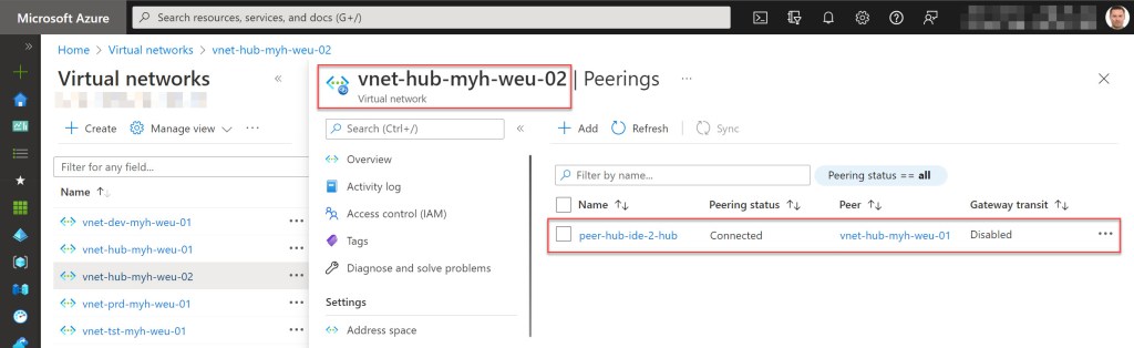 Add-AzVirtualNetworkPeering -Name $peeringNameHub1 -VirtualNetwork $vnetManagementHub -RemoteVirtualNetworkId $remoteIdentityHubVirtualNetworkId -AllowGatewayTransit | Out-Null