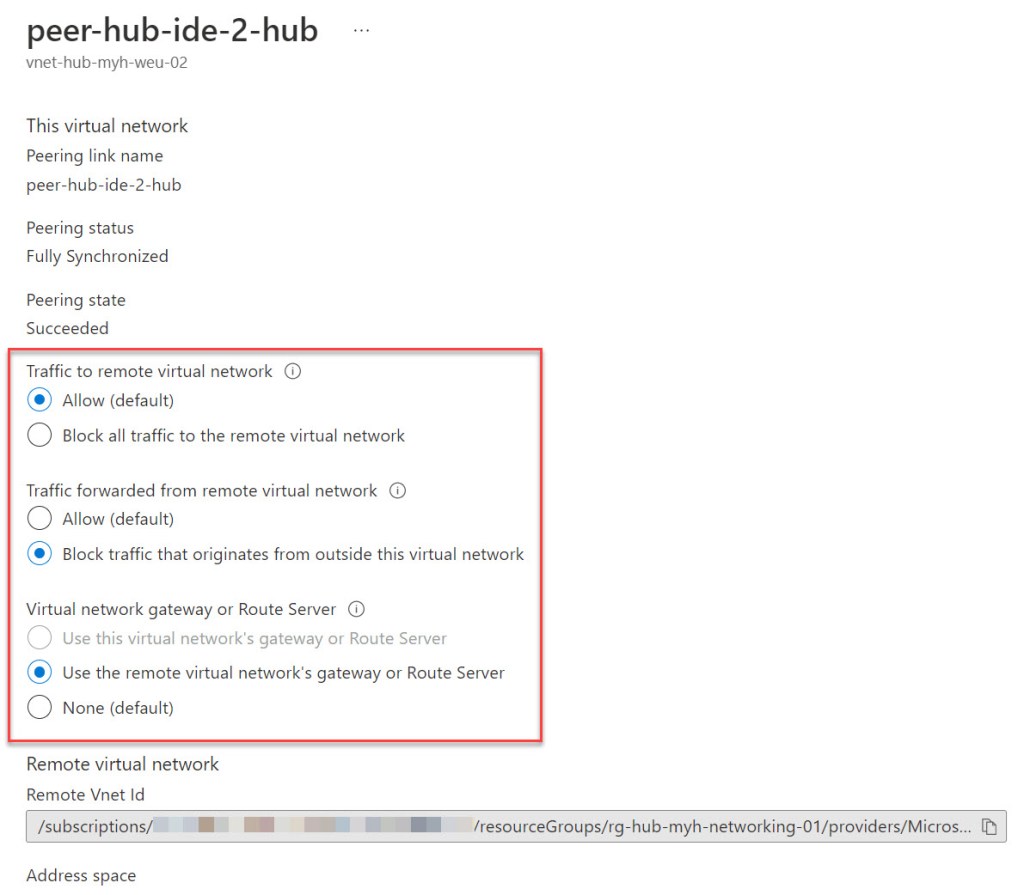 Add-AzVirtualNetworkPeering -Name $peeringNameIde1 -VirtualNetwork $vnetIdentityHub -RemoteVirtualNetworkId $remoteManagementHubVirtualNetworkId -UseRemoteGateways | Out-Null