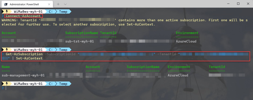 Set-AzContext -TenantId $tenant.TenantId -SubscriptionId $subNameManagement.SubscriptionId | Out-Null