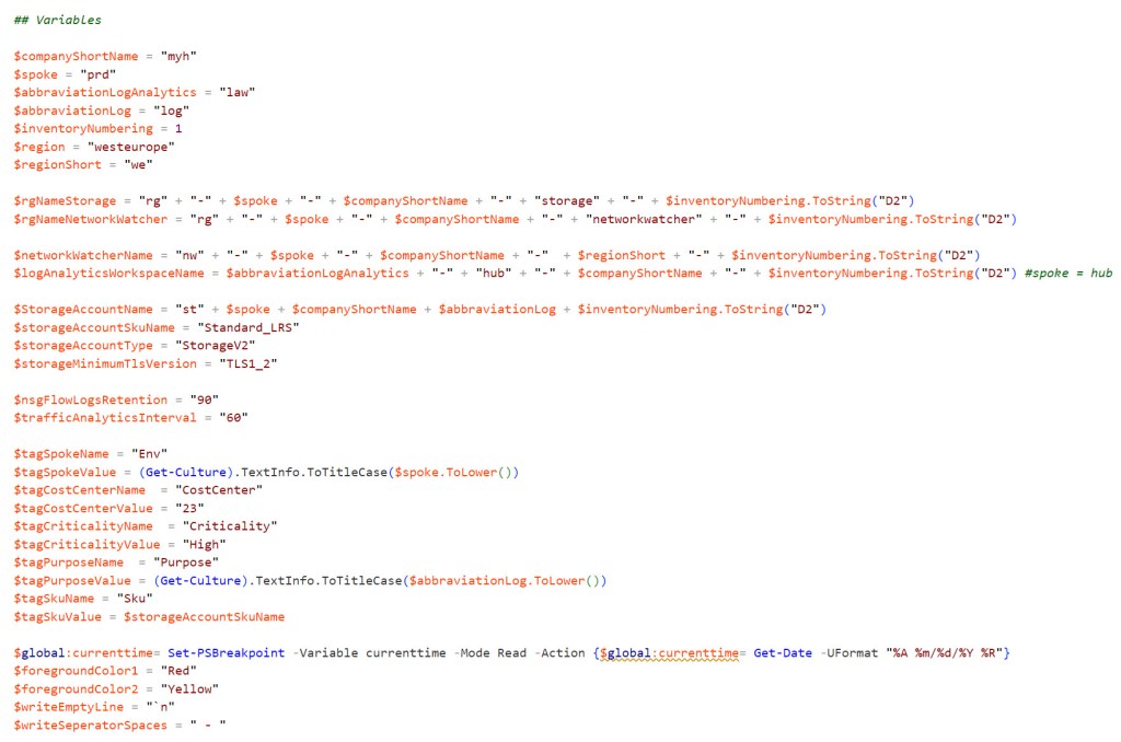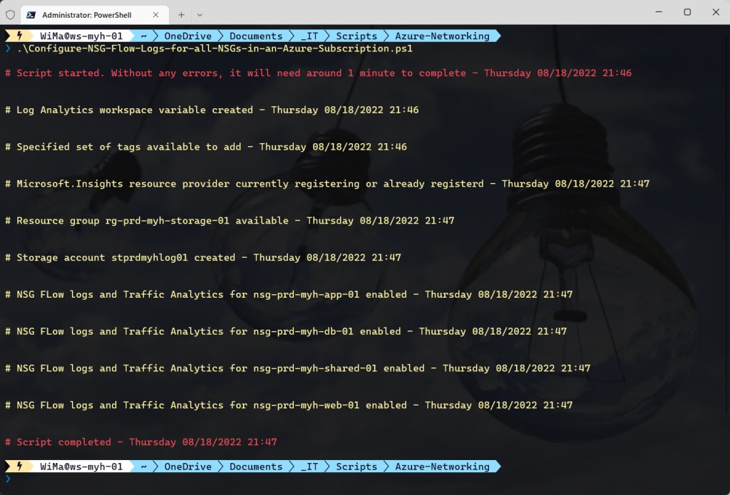 To use the script copy and save it as Configure-NSG-Flow-Logs-for-all-NSGs-in-an-Azure-Subscription.ps1 or download it from GitHub. Then before using the script, adjust all variables to your use and then run the customized script from Windows Terminal, Visual Studio Code, or Windows PowerShell. Or you can simply run it from Cloud Shell.