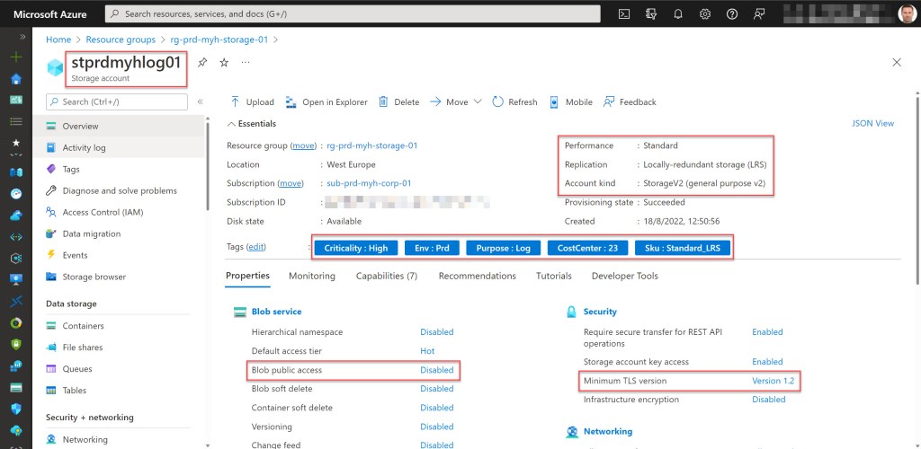 -AllowBlobPublicAccess $false -MinimumTlsVersion $storageMinimumTlsVersion | Out-Null