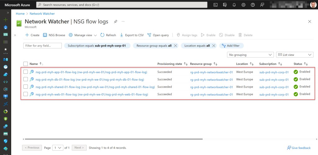After you ran the script, you can also use the built-in policy “Flow log should be configured for every network security group” to audit all NSGs in a given scope, and to check for the existence of linked Flow Logs.