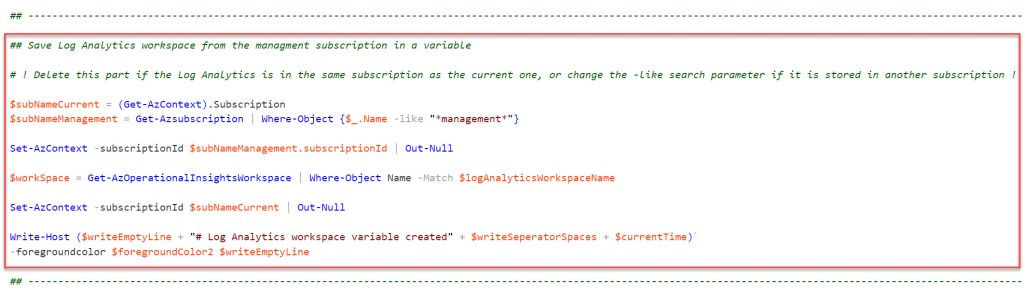 Write-Host ($writeEmptyLine + "# Log Analytics workspace variable created" + $writeSeperatorSpaces + $currentTime)`
