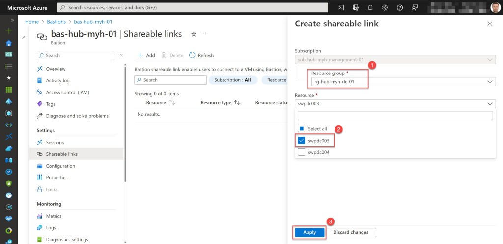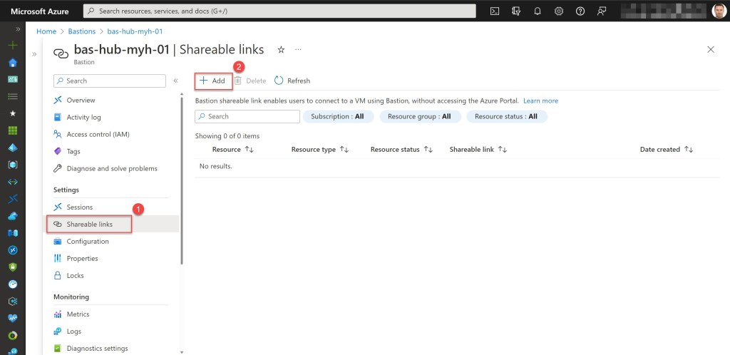 In the Azure Portal, go back to your bastion resource, and on the Bastion page under Settings, click Shareable links. Then, to create your shareable link, click +Add.