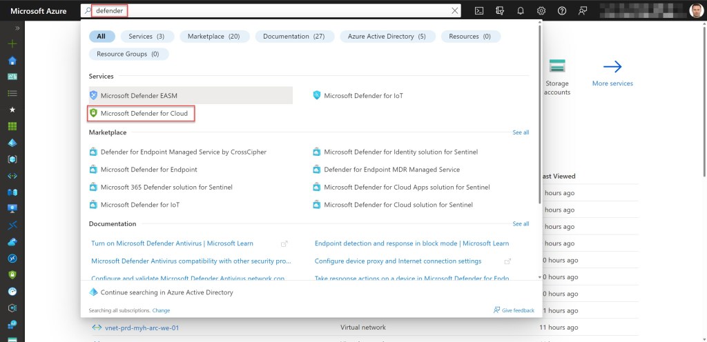 To add these extra security contacts through the Azure portal, first of all, logon to the portal and type in “defender” in the global search box in the top bar. Then select Microsoft Defender for the Cloud.