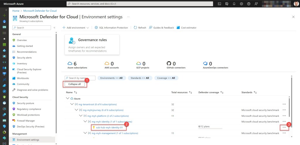 On the Microsoft Defender for Cloud page (blade), scroll down to the Management section and click on Environment settings.