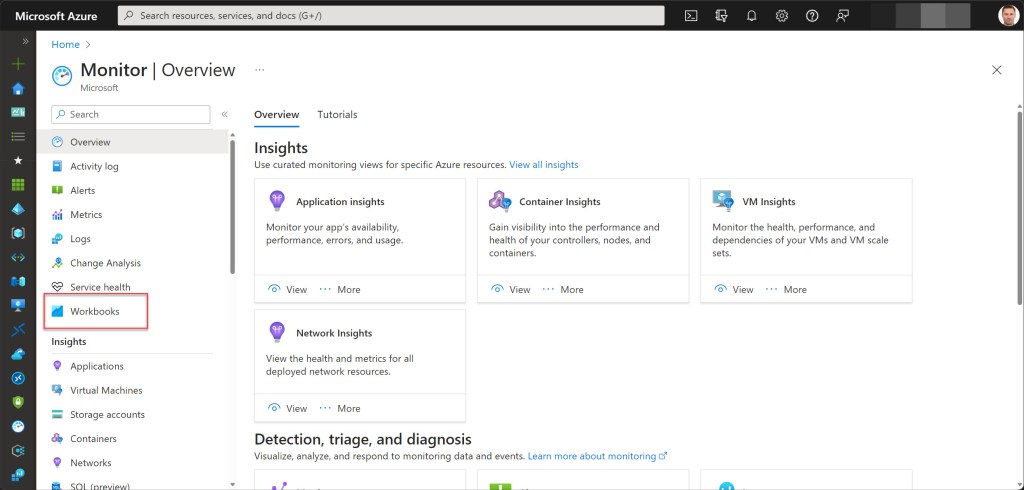 Logon to the portal and type in “workbooks” in the global search box in the top bar. Then select Azure Workbooks.
