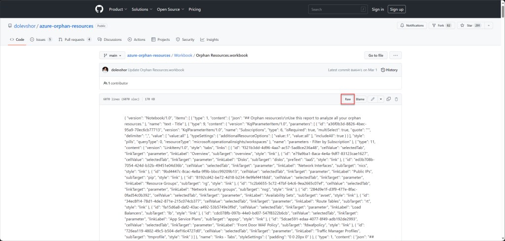 On the GitHub page, click on Workbook and then select the OrphanResources.workbook file (always select a .workbook or .json file to import).