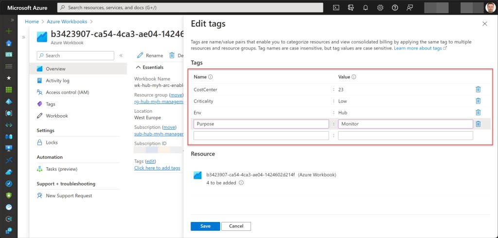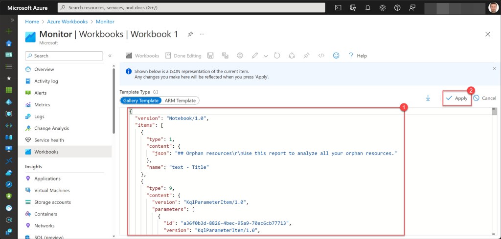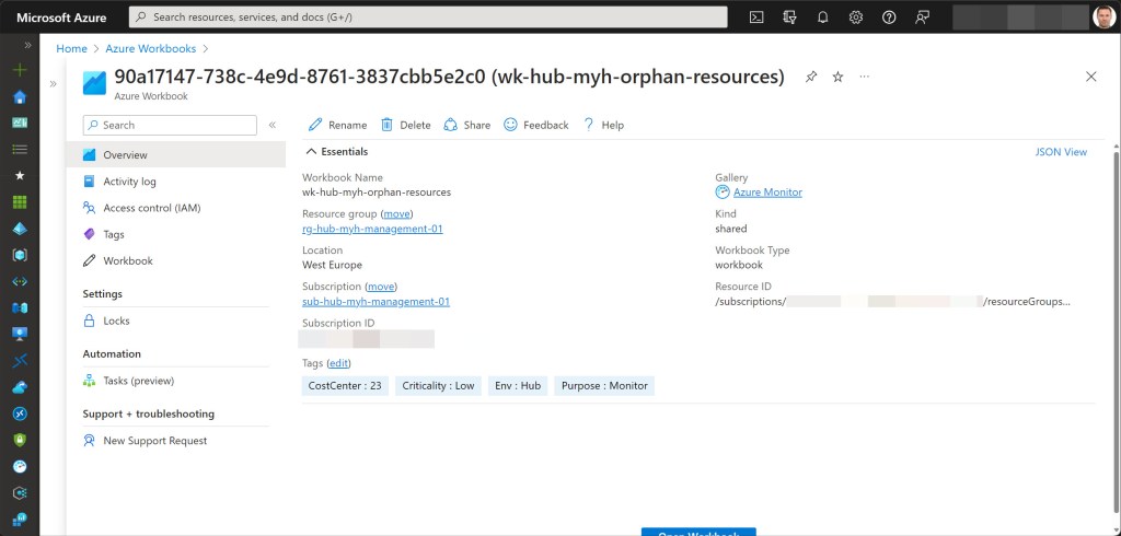 Fill in all required parameters and click “Apply.” I always use a management resource group (rg-hub-myh-management-01) from my management Azure subscription (sub-hub-myh-management-01) to store all my Azure Workbooks.