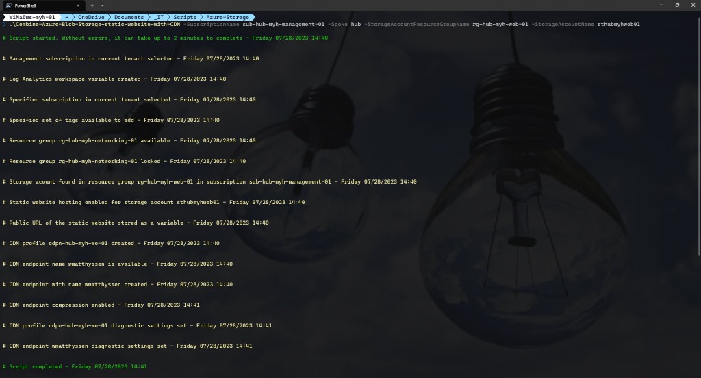 To use the script, copy and save it as Combine-Azure-Blob-Storage-static-website-with-CDN.ps1 or download it from GitHub. Then, before using the script, adjust all variables to your needs, and then run the customized script from Windows Terminal, Visual Studio Code, or Windows PowerShell. Or you can simply run it from Cloud Shell.