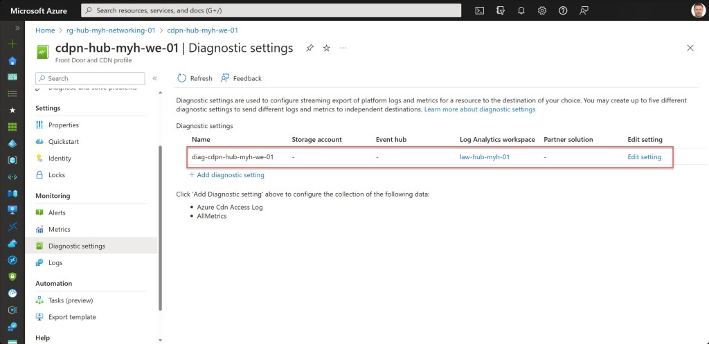 Get-AzDiagnosticSetting -Name $cdnDiagnosticsName -ResourceId ($cdnProfile.Id) -ErrorAction Stop | Out-Null