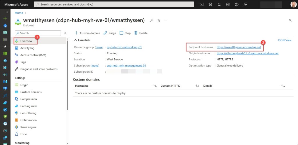 -> .\Combine-Azure-Blob-Storage-static-website-with-CDN -SubscriptionName sub-hub-myh-management-01 -Spoke hub -StorageAccountResourceGroupName rg-hub-myh-web-01 -StorageAccountName sthubmyhweb01