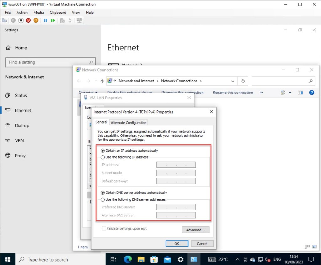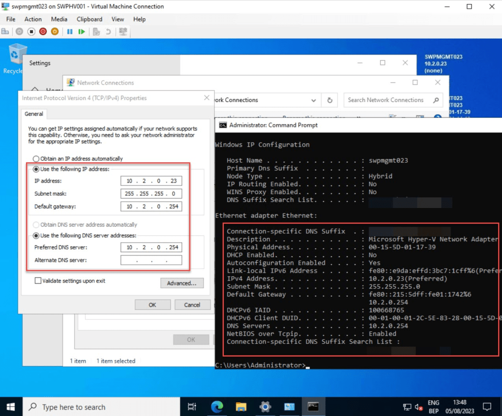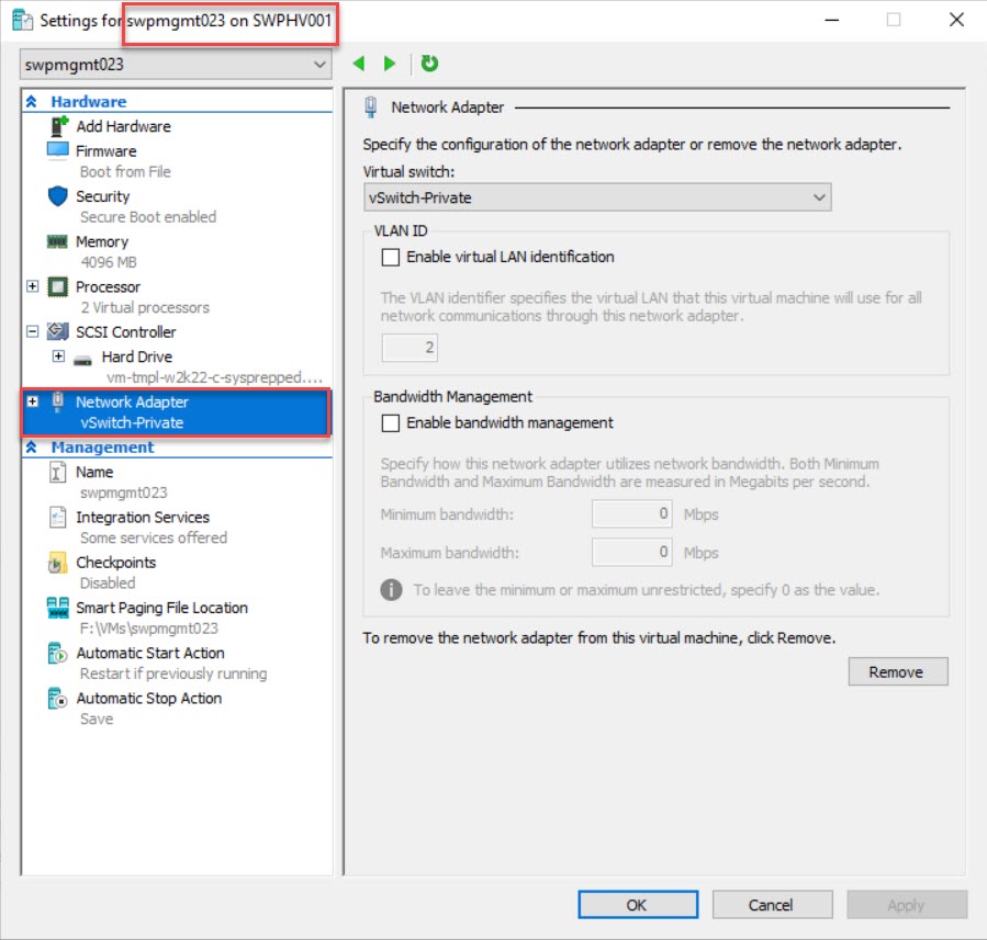 - A Hyper-V VM, running Windows Server 2019 or 2022 and serving as a management server, that is utilizing the same vSwitch for LAN connectivity as the pfSense VM and relies on the pfSense VM as both its default gateway and DNS server.