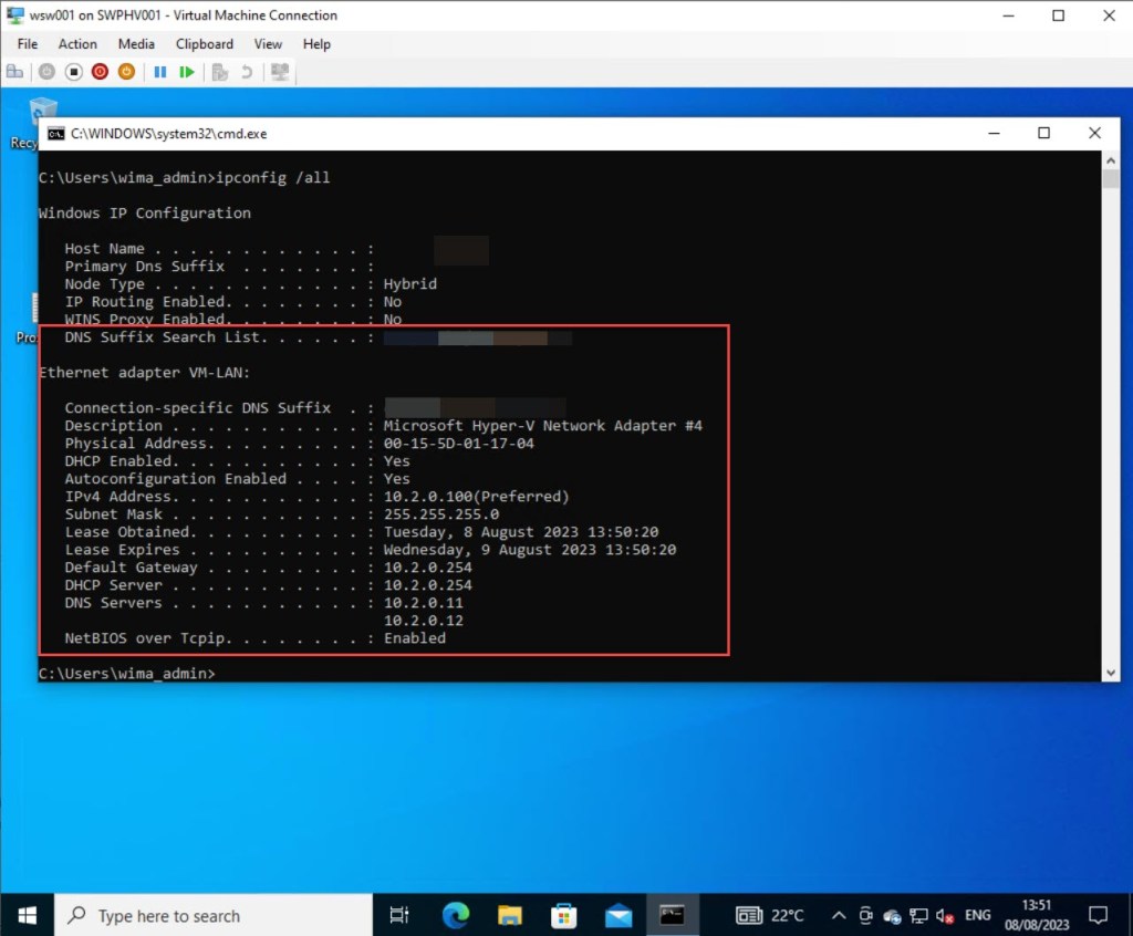 Next, log in to your client VM running Windows 10 or 11, and verify if all DHCP settings have been properly configured and that you can browse the Internet.
