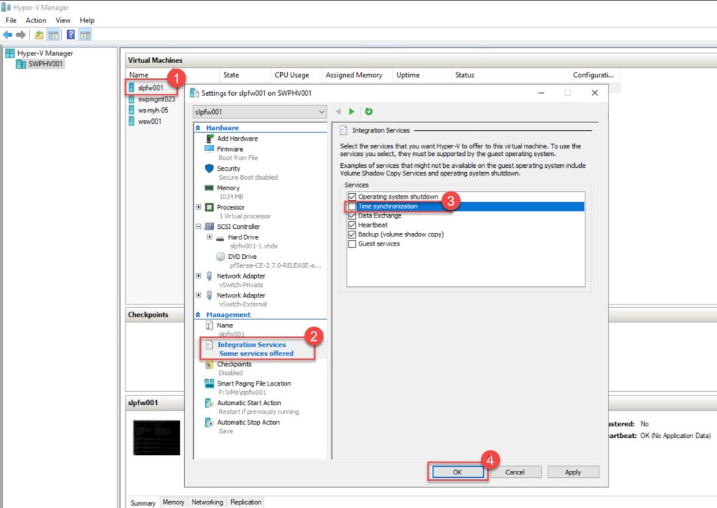 To achieve this, simply right-click on your pfSense VM, choose “Settings…,” navigate to “Integration Services,” and then deselect “Time synchronization.” Remember to apply the changes by clicking “OK.”